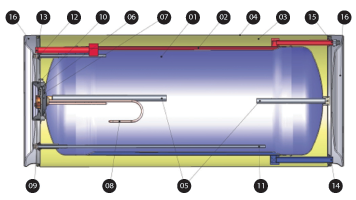 - 01 Termoacumulador de água em aço laminado a frio, com 2.5 mm de espessura e dupla camada interna de vitrificado a 860 °C, segundo DIN 4753. O vitrificado realiza-se em instalações industriais de alta tecnologia. Os termoacumuladores são verificados um a um à saída da unidade de vitrificação, garantindo a alta qualidade do vitrificado.